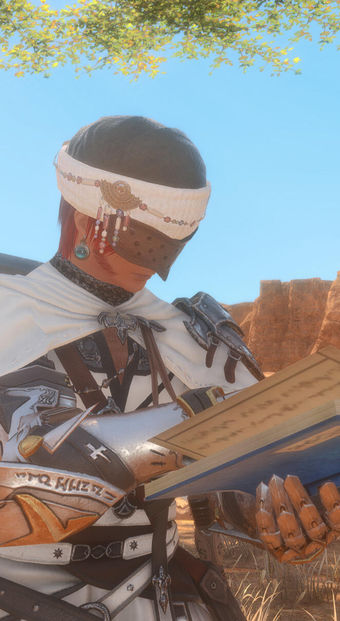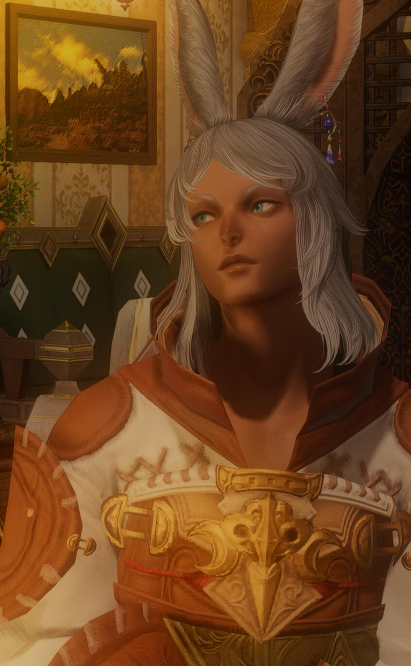 Expatriate: Particularly partial to fellow Dalmascans, Mahir tends to be amicable to anyone else forced from their place of origin. Sharlayans however, he will inevitably react with thinly-veiled hostility.Patron of the Arts: Are you wealthy? Do you have an appreciation for fine crafts? Maybe you've commissioned him before, or his work was recommended to you. While his forte is bookmaking, right down to the binding, his other passion is photography. He has been known to take portrait commissions for the right price.For Ala Mhigo: Perhaps out of a sense of solidarity, Mahir's name is known among many Ala Mhigans as a supplier of goods and resources to the Resistance during the occupation. A small handful know his skill making non-toxic inks and papers, allowing Resistance members to dispose of incriminating evidence easily.Grace of the Gods: The viera has long been a diligent transcriber of religious texts, first and foremost. He has crafted a number of illuminated manuscripts, and still loves to appraise any brought to him.